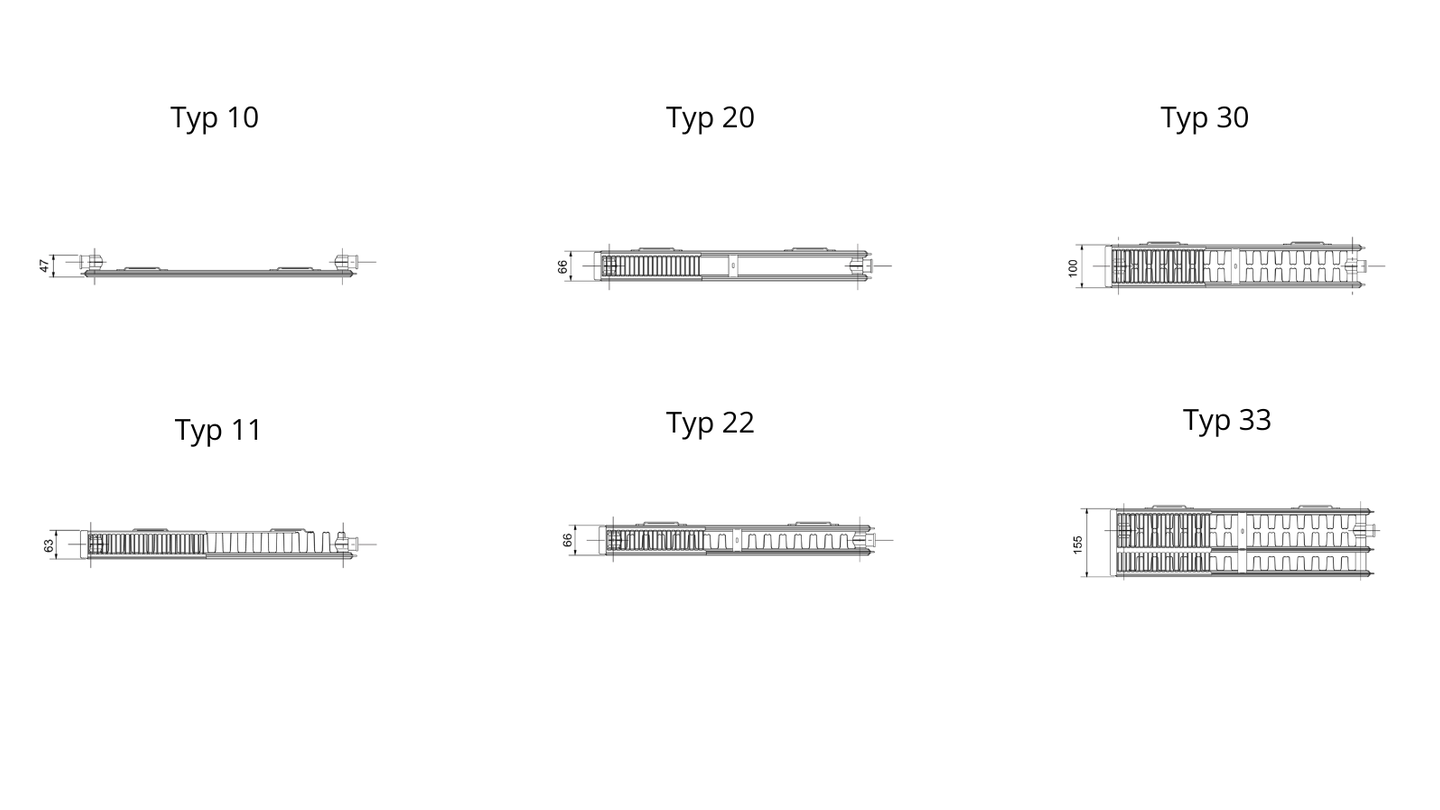 - Typ 10 – ploché, úzké, vhodné například jako malý radiátor třeba na WC, do komory