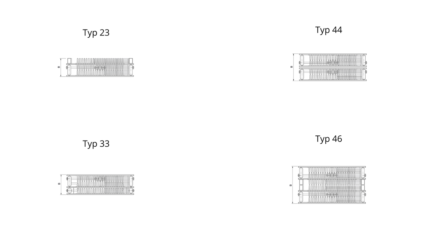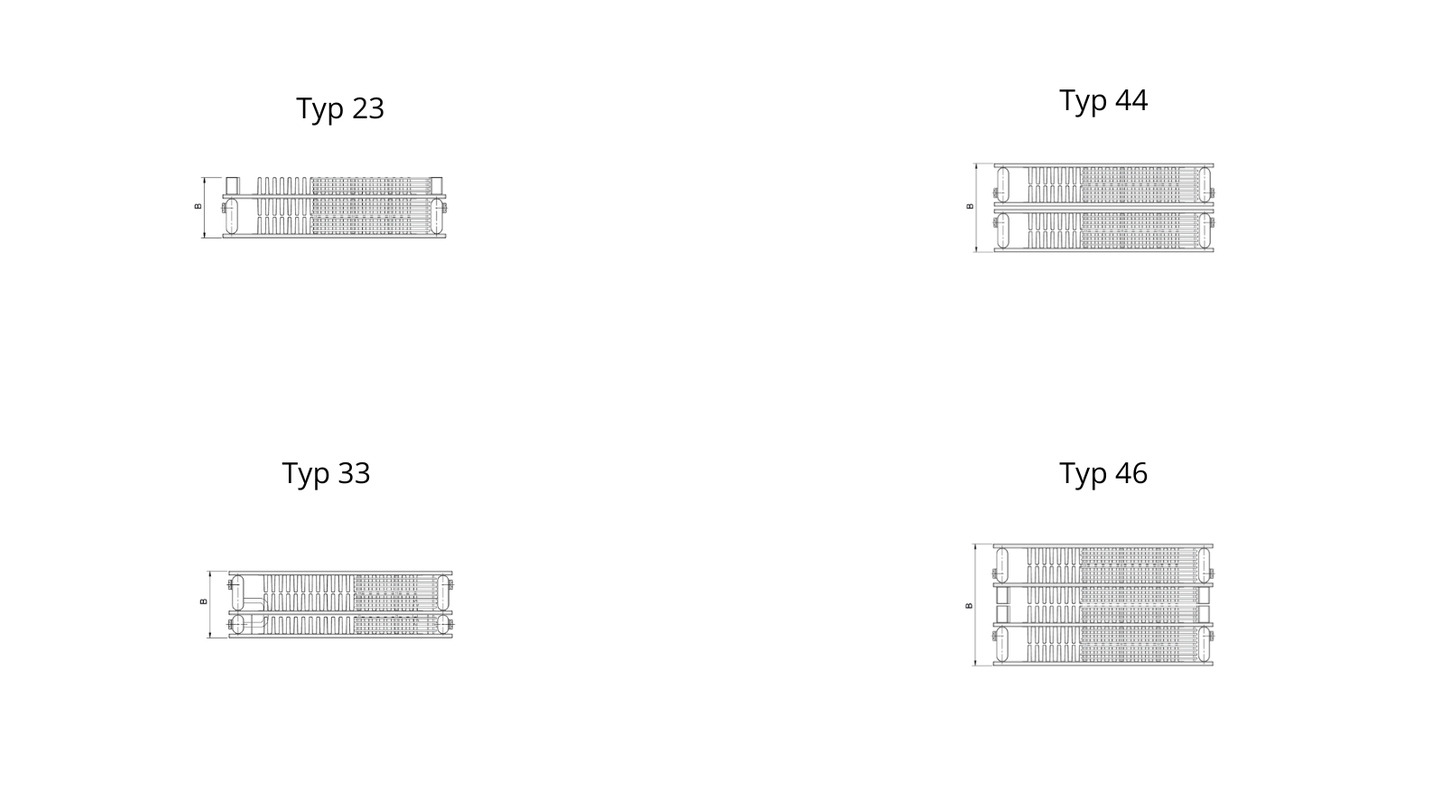 - Typ 33 – nejvyšší výkon, i ve velmi krátké délce, třeba jako malý radiátor vhodný pod okna s nízkým parapetem nebo do podkrovních prostor